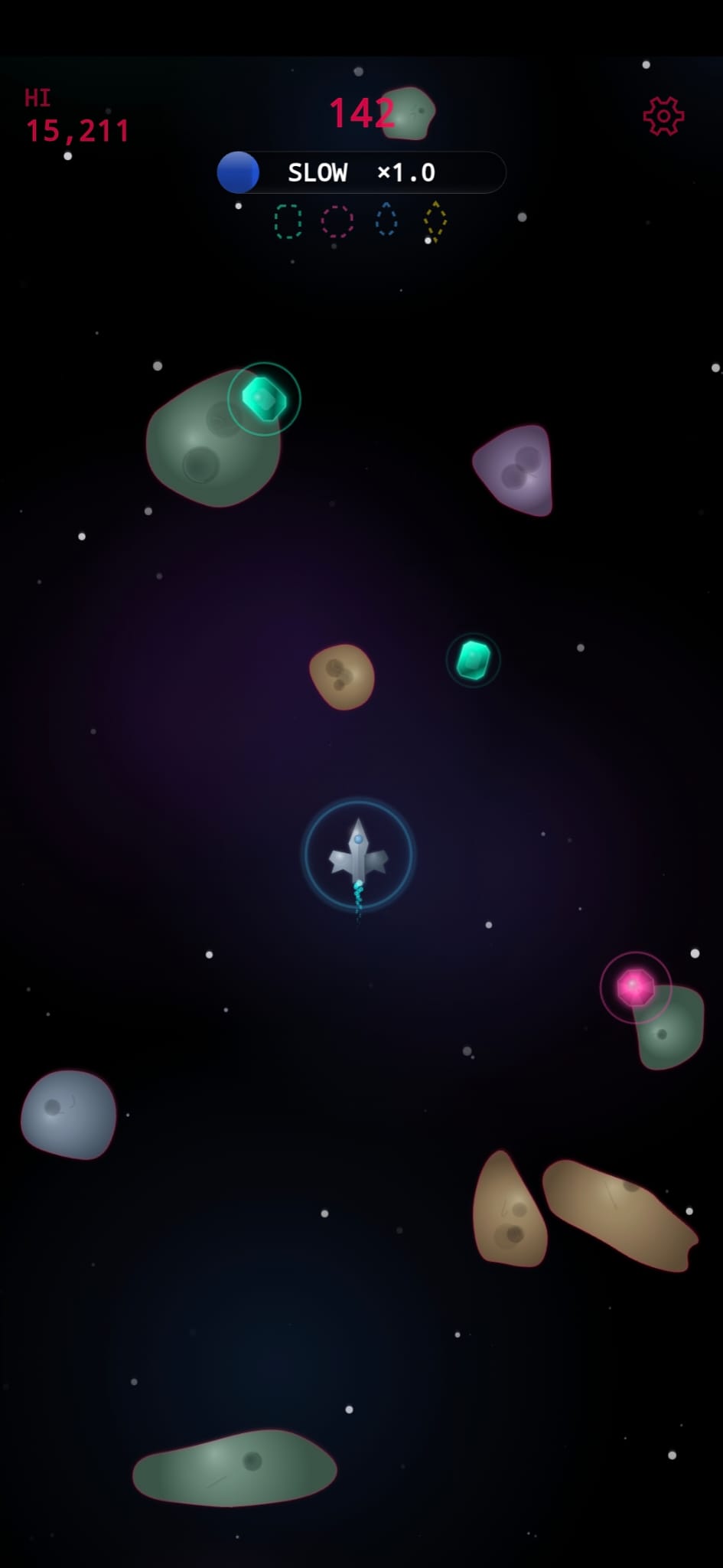 The closer you fly to danger, the more you're rewarded — graze past asteroids for bonus points, chain gem pickups into combos, and more! Grab power-ups like shields, magnets, time warps, and pulse bombs to stay alive.
